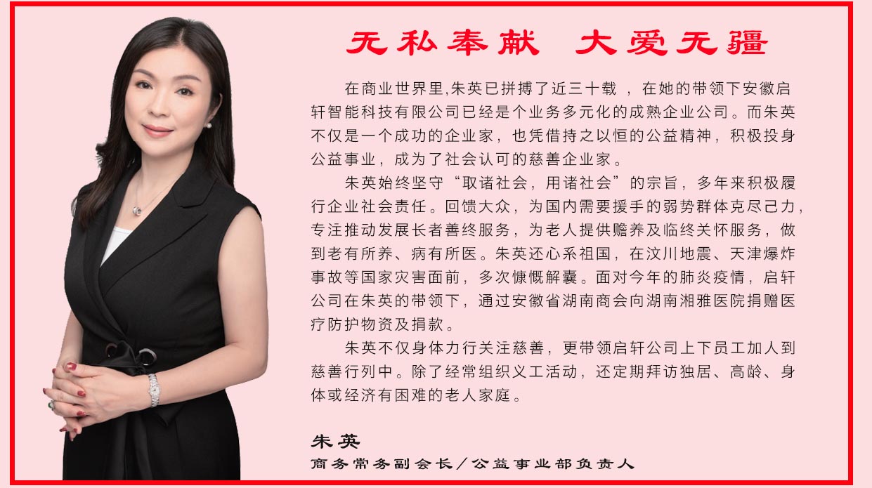 安徽省湖南商会领导班子,以张友吉会长为首、舒红武秘书长和商会慈善大使朱英常务副会长开始带动商会会员做公益,张友吉会长倡导大家:“湘商要率先转变价值观,要从分配财富转型为创造财富,从打天下变为经营天下。湘商要成为经济财富的创造者,公益社会的推动者,和谐社会的建设者,先进文化的创造者。”